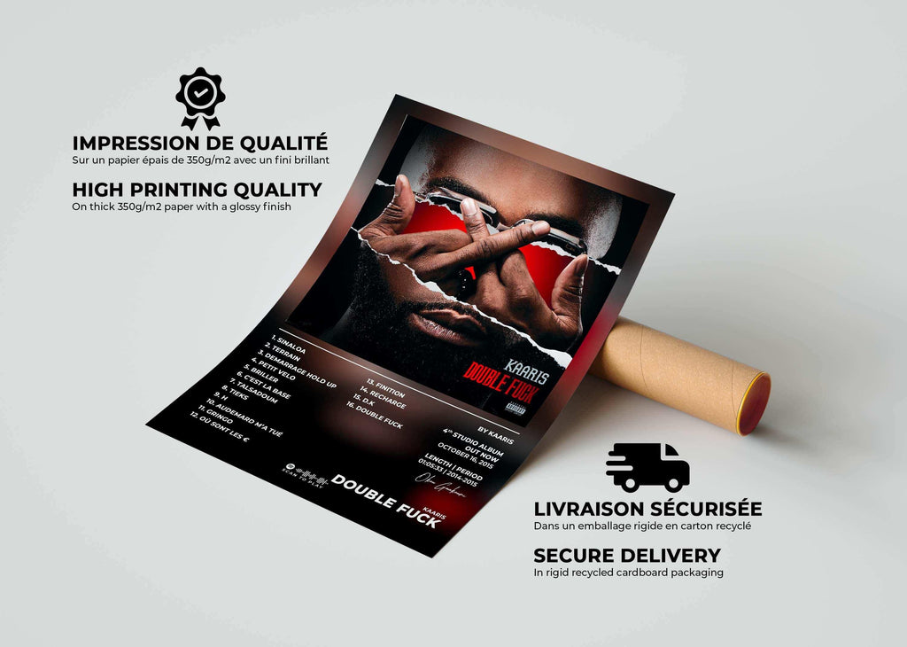 Les disques d'or sont envoyés dans des cartons rigides recyclés rectangulaires, adaptés à la taille commandée, pour garantir leur protection. Les posters au format A5 et A4 seront expédiés dans une épaisse enveloppe matelassée, tandis que les formats A3 et A2 seront soigneusement roulés et envoyés dans des tubes de livraison rigides et écologiques. Ces solutions d'emballage assurent une réception en parfait état de votre commande.