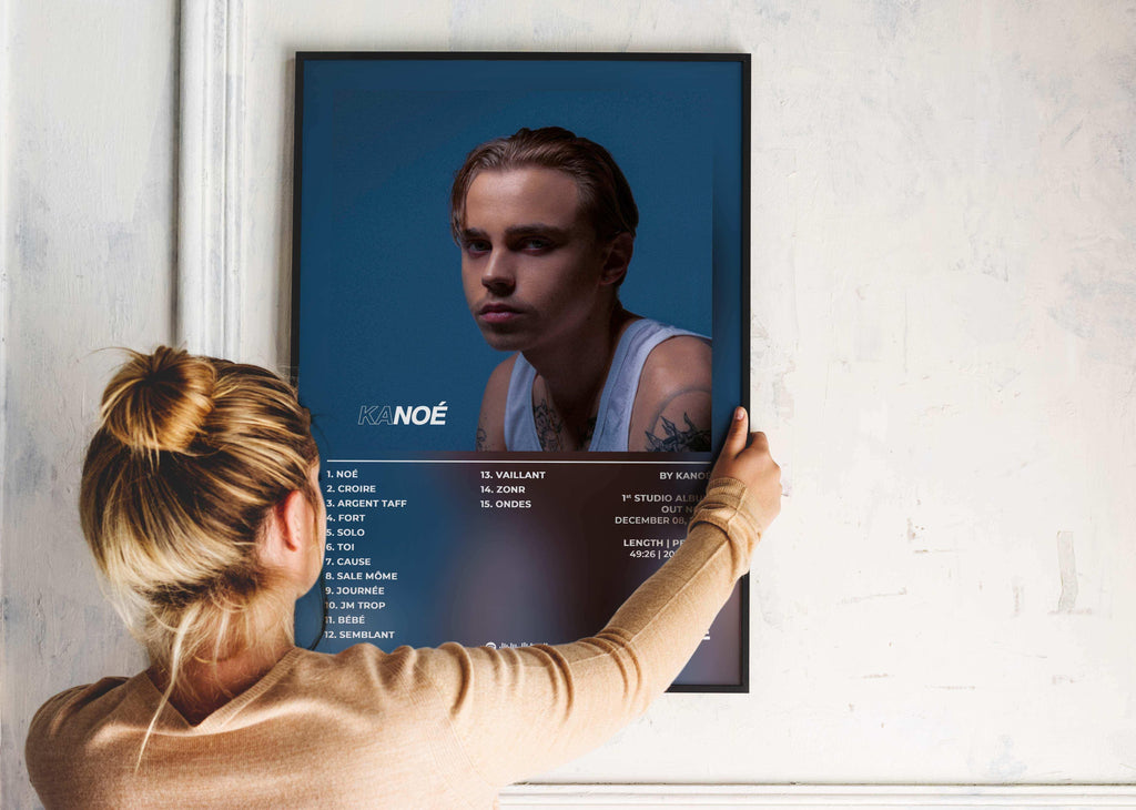 Affiche album Kanoé sur fond bleu, fait en France, livraison 48h gratuite, cadeau Noël idéal