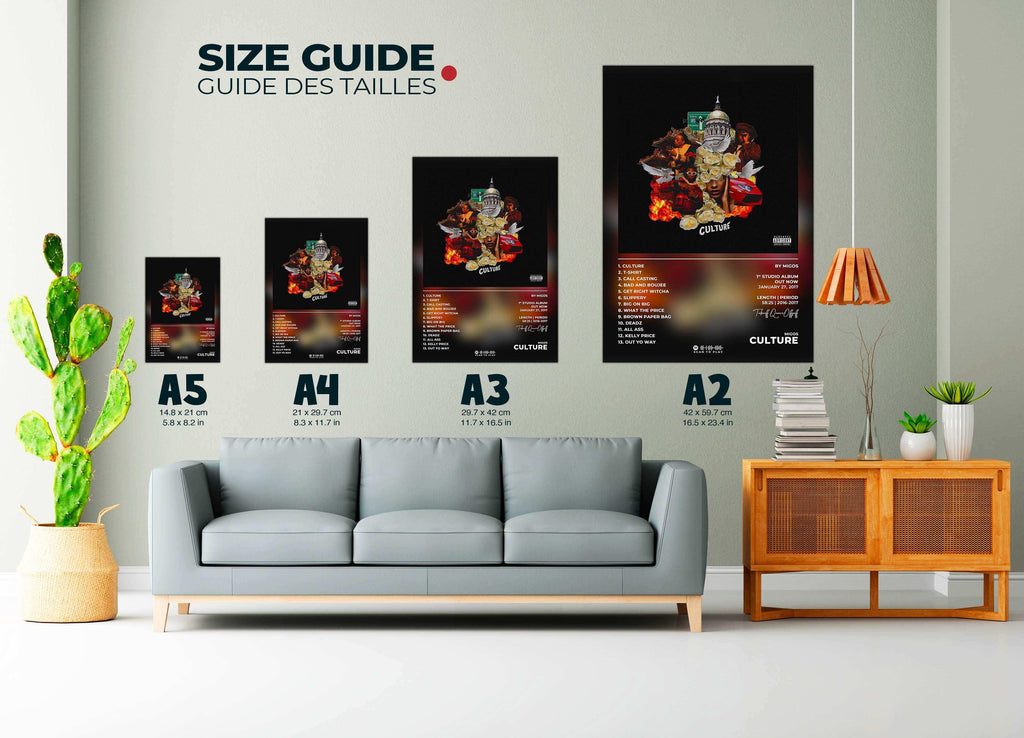 Les disques d'or sont envoyés dans des cartons rigides recyclés rectangulaires, adaptés à la taille commandée, pour garantir leur protection. Les posters au format A5 et A4 seront expédiés dans une épaisse enveloppe matelassée, tandis que les formats A3 et A2 seront soigneusement roulés et envoyés dans des tubes de livraison rigides et écologiques. Ces solutions d'emballage assurent une réception en parfait état de votre commande.