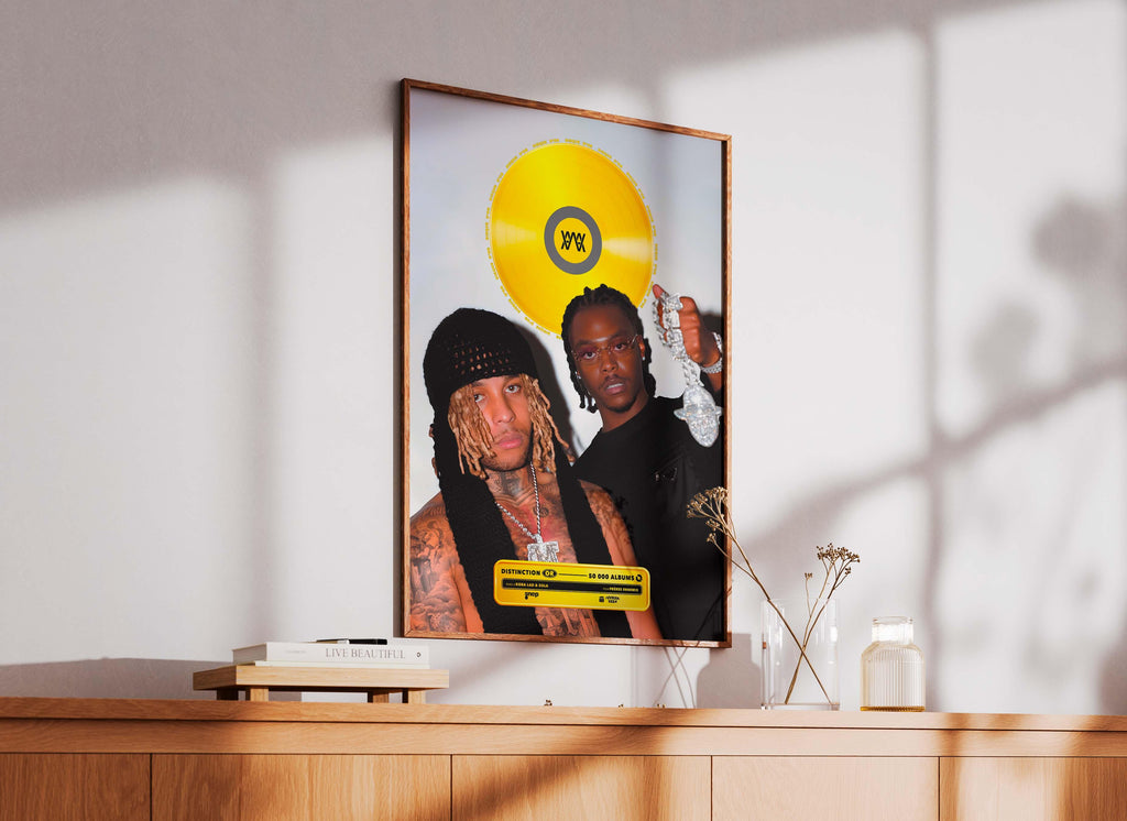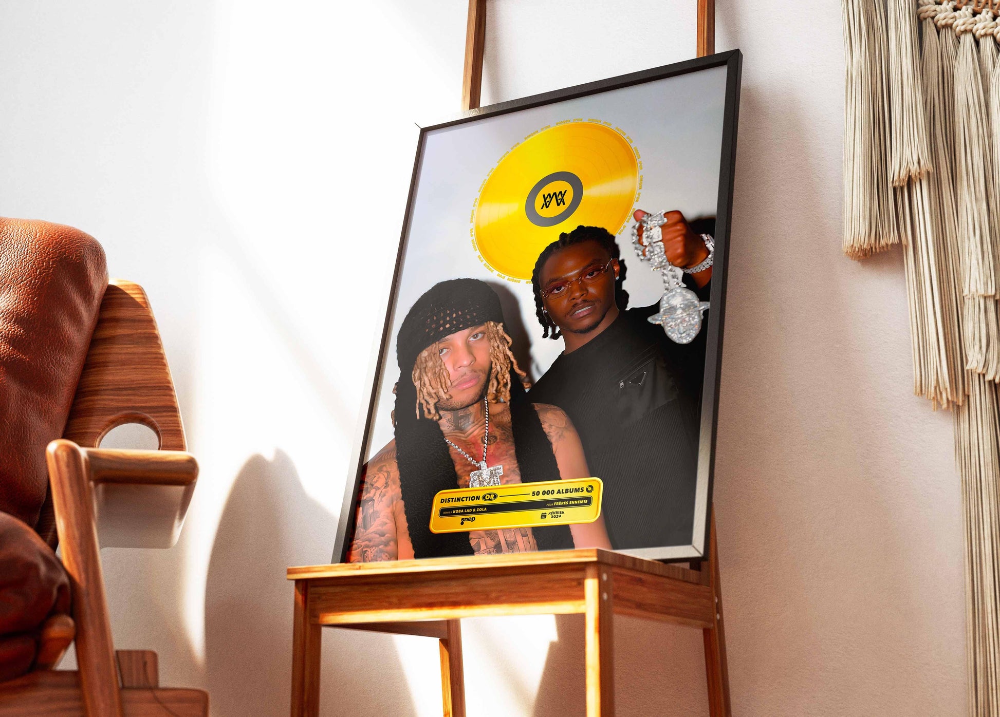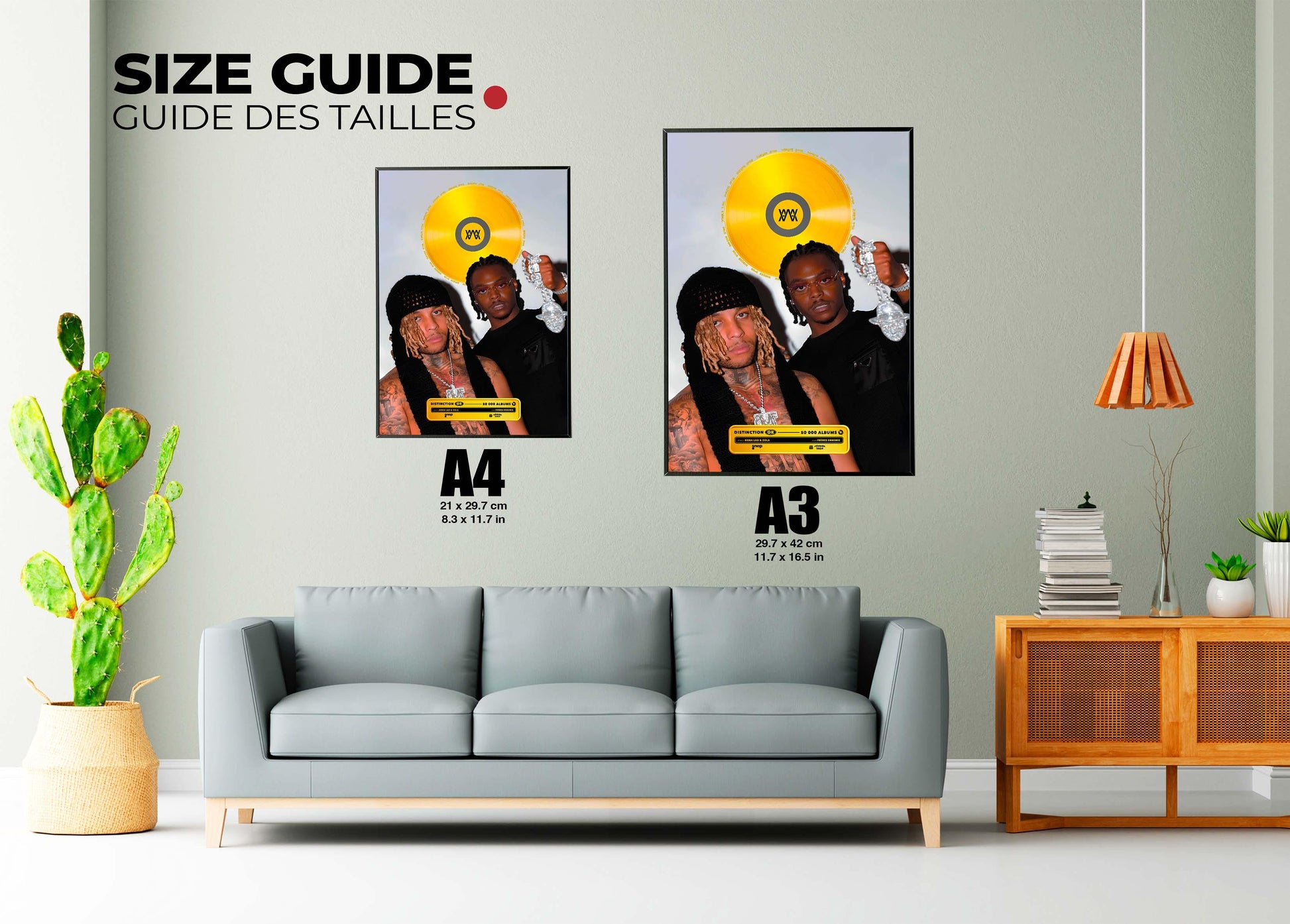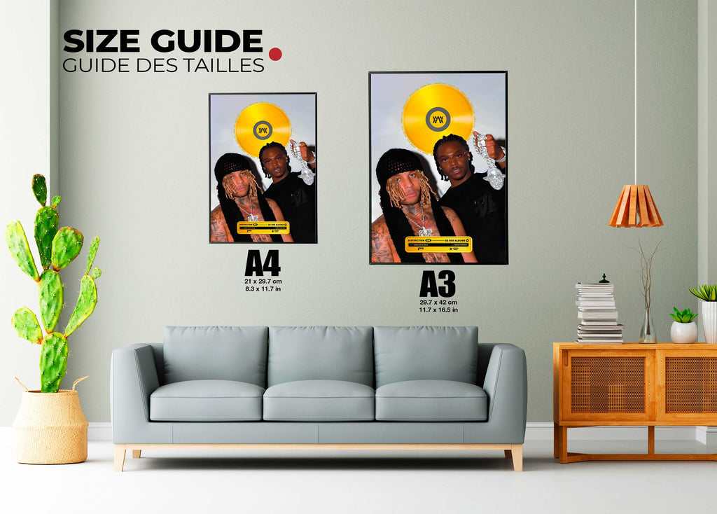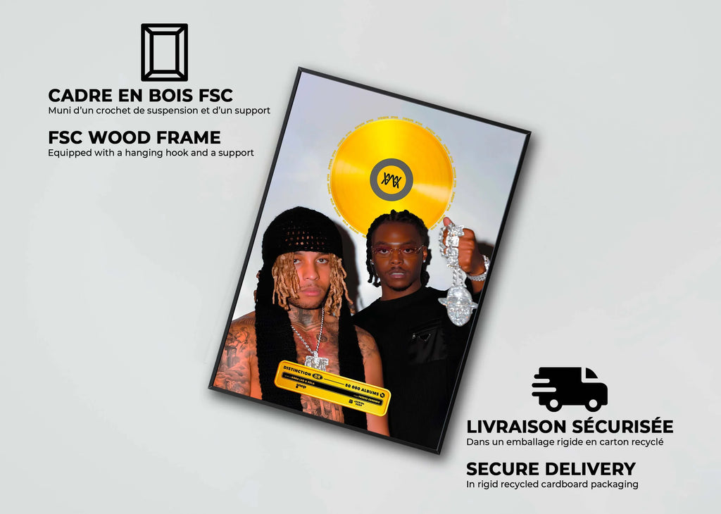 Les disques d'or sont envoyés dans des cartons rigides recyclés rectangulaires, adaptés à la taille commandée, pour garantir leur protection. Les posters au format A5 et A4 seront expédiés dans une épaisse enveloppe matelassée, tandis que les formats A3 et A2 seront soigneusement roulés et envoyés dans des tubes de livraison rigides et écologiques. Ces solutions d'emballage assurent une réception en parfait état de votre commande.