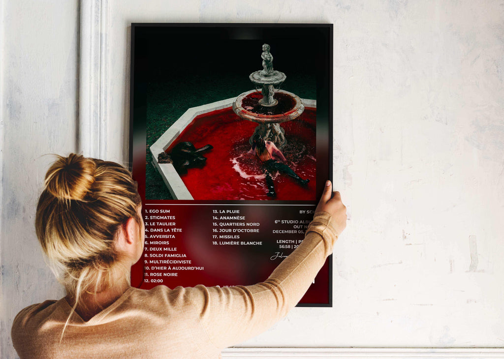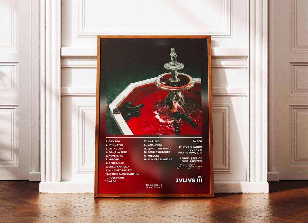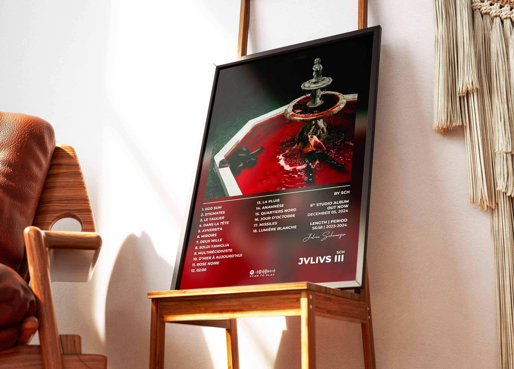 Scanne simplement le code sur le poster avec ton app de streaming pour que la musique prenne vie dans ton espace intérieur. Chaque poster devient une œuvre d'art et une passerelle vers tes albums préférés.