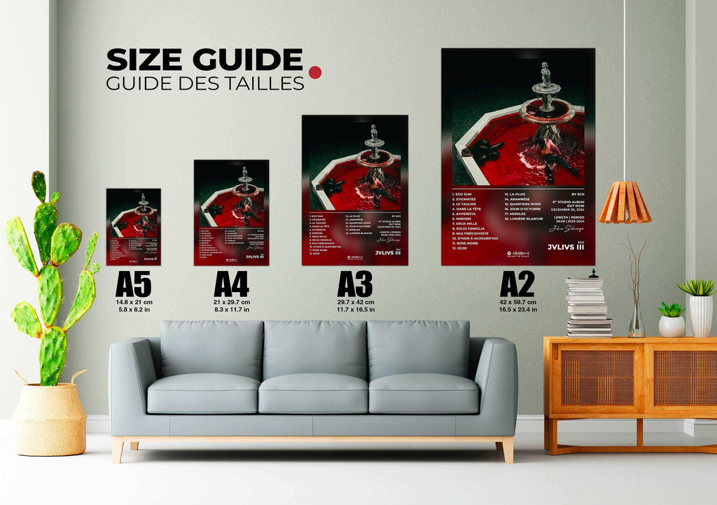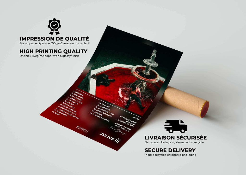 Les disques d'or sont envoyés dans des cartons rigides recyclés rectangulaires, adaptés à la taille commandée, pour garantir leur protection. Les posters au format A5 et A4 seront expédiés dans une épaisse enveloppe matelassée, tandis que les formats A3 et A2 seront soigneusement roulés et envoyés dans des tubes de livraison rigides et écologiques. Ces solutions d'emballage assurent une réception en parfait état de votre commande.