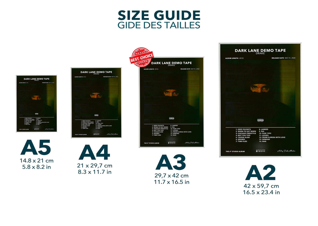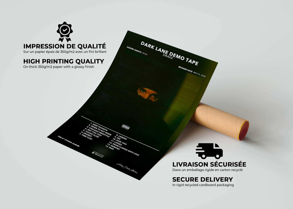 Les disques d'or sont envoyés dans des cartons rigides recyclés rectangulaires, adaptés à la taille commandée, pour garantir leur protection. Les posters au format A5 et A4 seront expédiés dans une épaisse enveloppe matelassée, tandis que les formats A3 et A2 seront soigneusement roulés et envoyés dans des tubes de livraison rigides et écologiques. Ces solutions d'emballage assurent une réception en parfait état de votre commande.