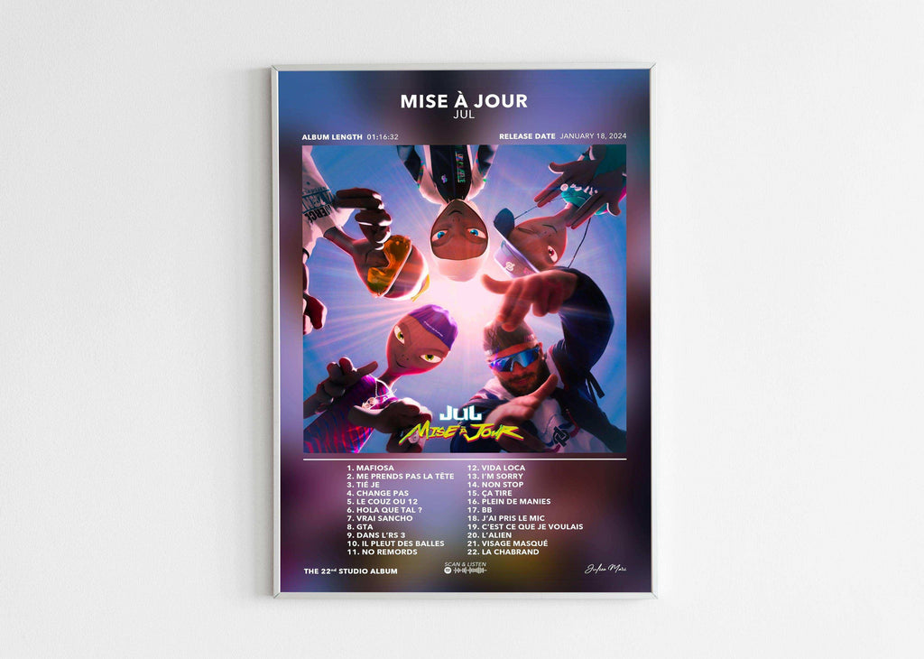 Scanne simplement le code sur le poster avec ton app de streaming pour que la musique prenne vie dans ton espace intérieur. Chaque poster devient une œuvre d'art et une passerelle vers tes albums préférés.