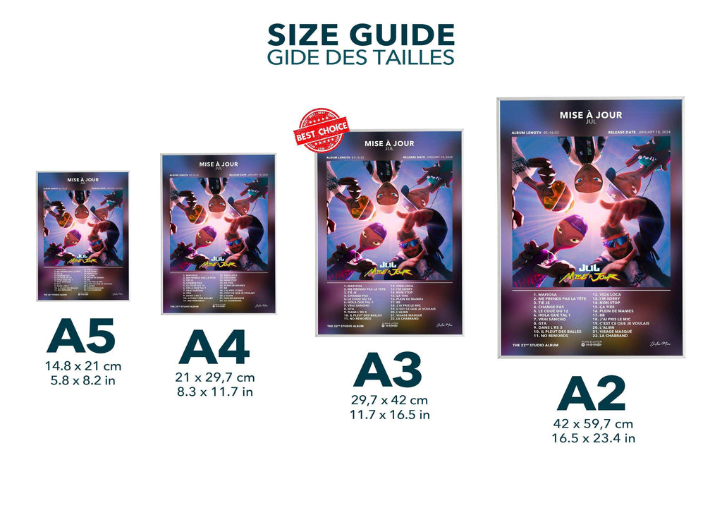 Les disques d'or sont envoyés dans des cartons rigides recyclés rectangulaires, adaptés à la taille commandée, pour garantir leur protection. Les posters au format A5 et A4 seront expédiés dans une épaisse enveloppe matelassée, tandis que les formats A3 et A2 seront soigneusement roulés et envoyés dans des tubes de livraison rigides et écologiques. Ces solutions d'emballage assurent une réception en parfait état de votre commande.