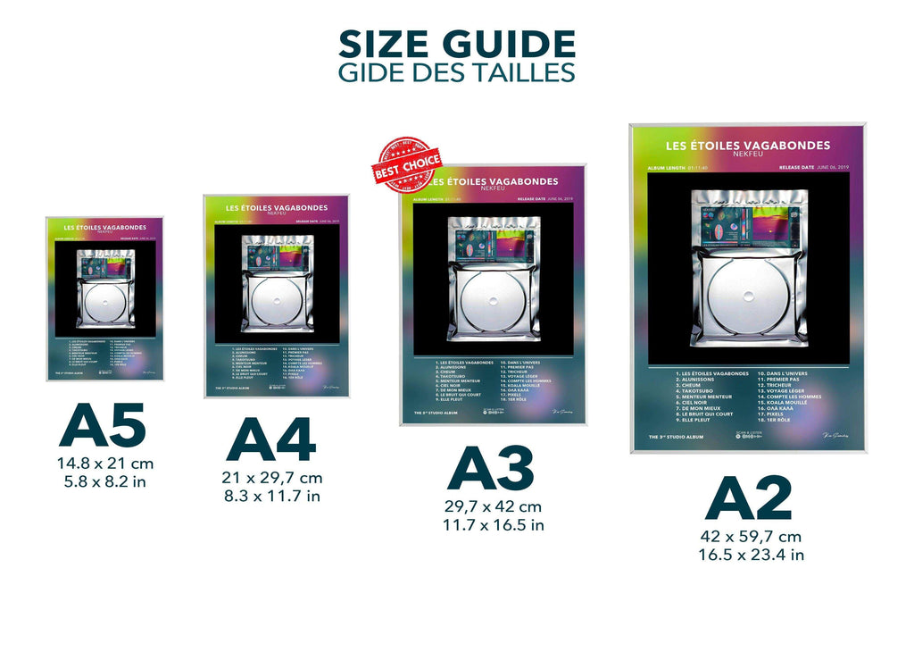 Les disques d'or sont envoyés dans des cartons rigides recyclés rectangulaires, adaptés à la taille commandée, pour garantir leur protection. Les posters au format A5 et A4 seront expédiés dans une épaisse enveloppe matelassée, tandis que les formats A3 et A2 seront soigneusement roulés et envoyés dans des tubes de livraison rigides et écologiques. Ces solutions d'emballage assurent une réception en parfait état de votre commande.