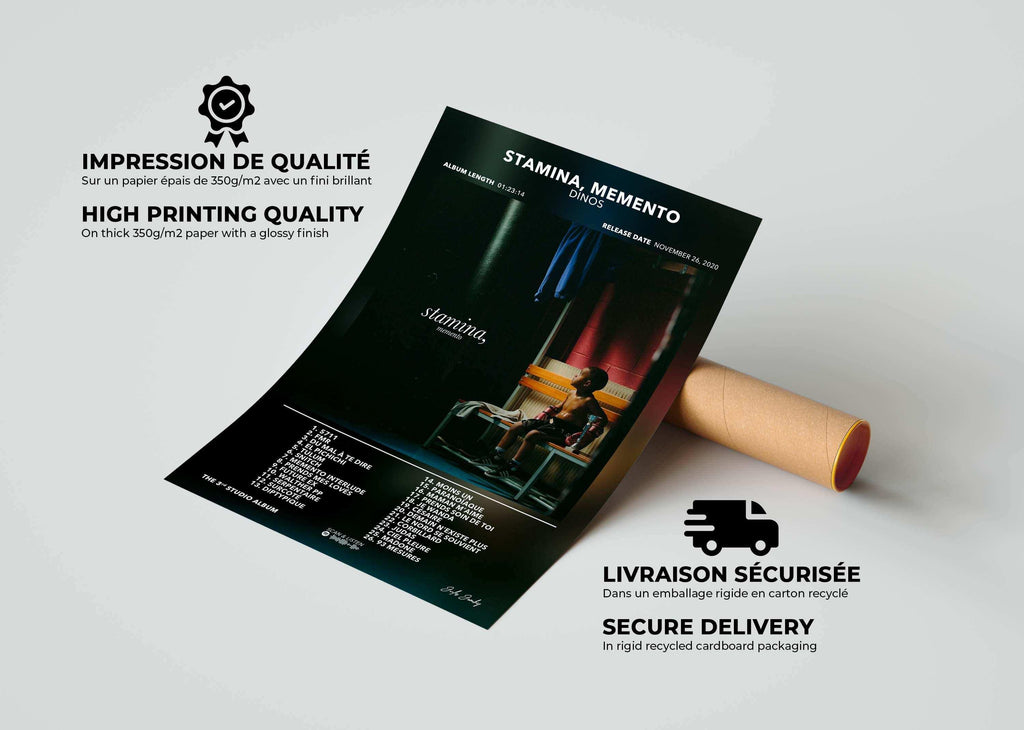 Les disques d'or sont envoyés dans des cartons rigides recyclés rectangulaires, adaptés à la taille commandée, pour garantir leur protection. Les posters au format A5 et A4 seront expédiés dans une épaisse enveloppe matelassée, tandis que les formats A3 et A2 seront soigneusement roulés et envoyés dans des tubes de livraison rigides et écologiques. Ces solutions d'emballage assurent une réception en parfait état de votre commande.
