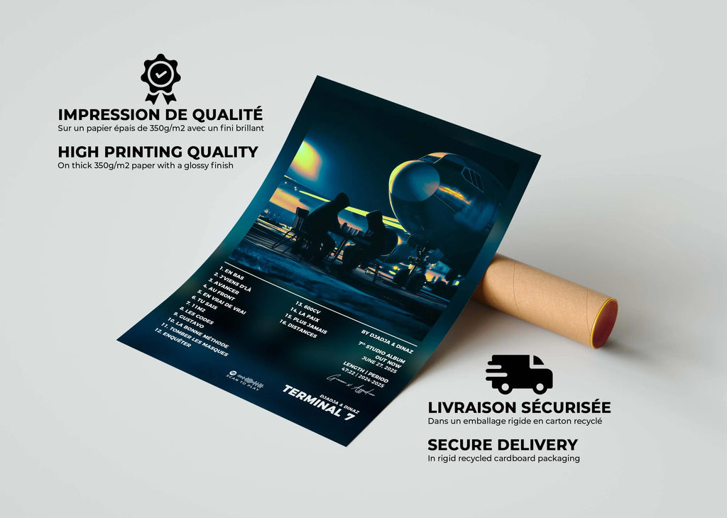 Les disques d'or sont envoyés dans des cartons rigides recyclés rectangulaires, adaptés à la taille commandée, pour garantir leur protection. Les posters au format A5 et A4 seront expédiés dans une épaisse enveloppe matelassée, tandis que les formats A3 et A2 seront soigneusement roulés et envoyés dans des tubes de livraison rigides et écologiques. Ces solutions d'emballage assurent une réception en parfait état de votre commande.