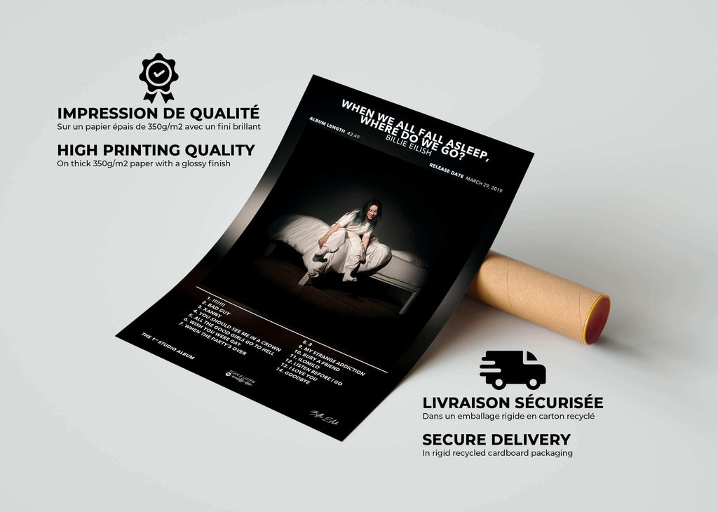 Les disques d'or sont envoyés dans des cartons rigides recyclés rectangulaires, adaptés à la taille commandée, pour garantir leur protection. Les posters au format A5 et A4 seront expédiés dans une épaisse enveloppe matelassée, tandis que les formats A3 et A2 seront soigneusement roulés et envoyés dans des tubes de livraison rigides et écologiques. Ces solutions d'emballage assurent une réception en parfait état de votre commande.
