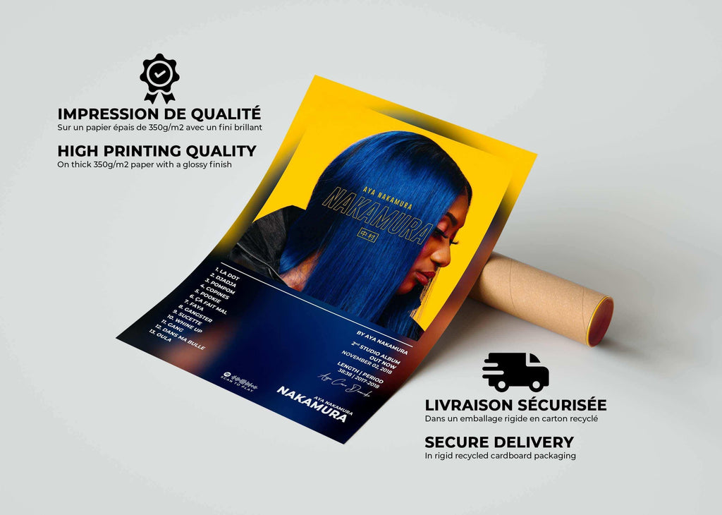 Les disques d'or sont envoyés dans des cartons rigides recyclés rectangulaires, adaptés à la taille commandée, pour garantir leur protection. Les posters au format A5 et A4 seront expédiés dans une épaisse enveloppe matelassée, tandis que les formats A3 et A2 seront soigneusement roulés et envoyés dans des tubes de livraison rigides et écologiques. Ces solutions d'emballage assurent une réception en parfait état de votre commande.