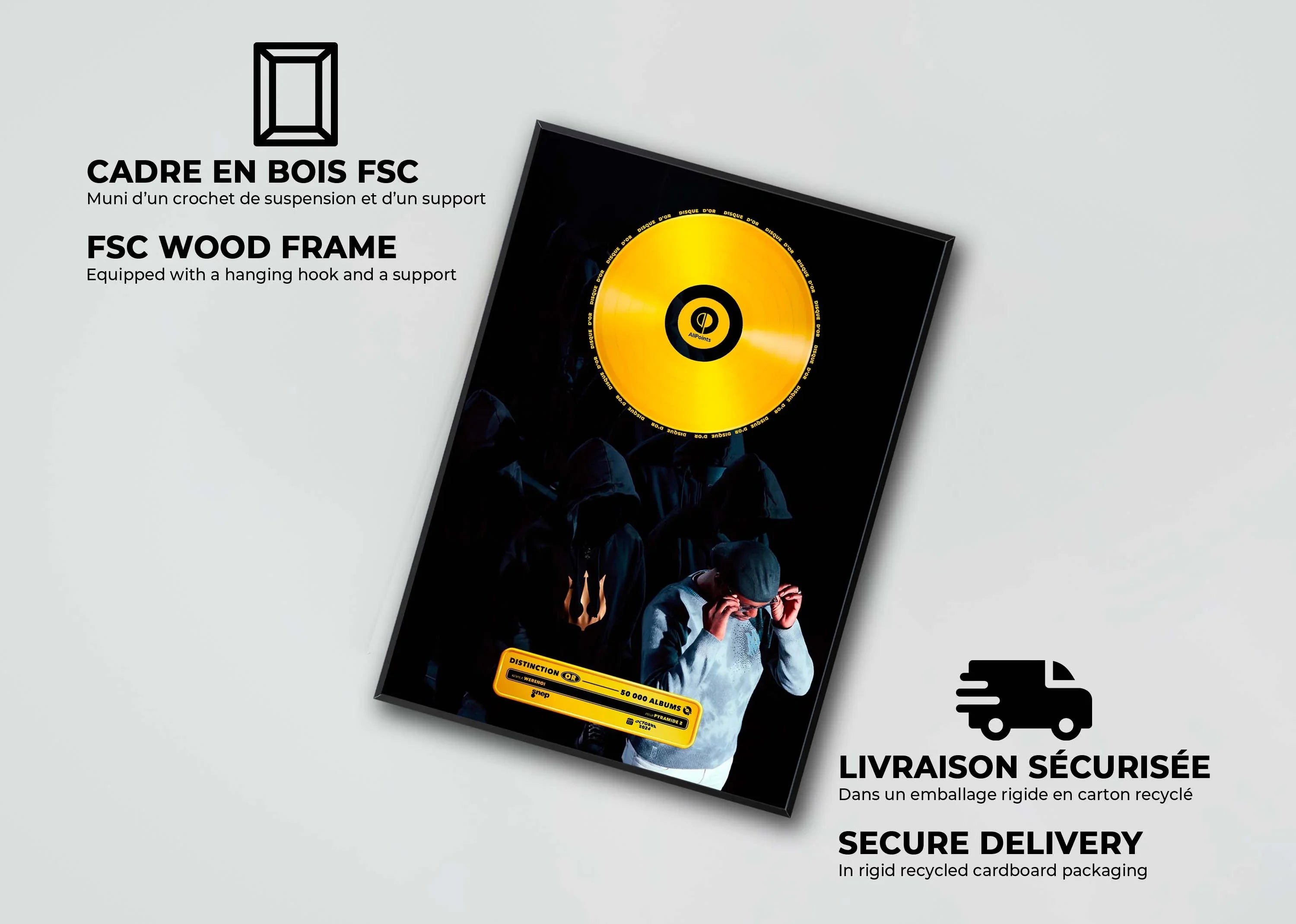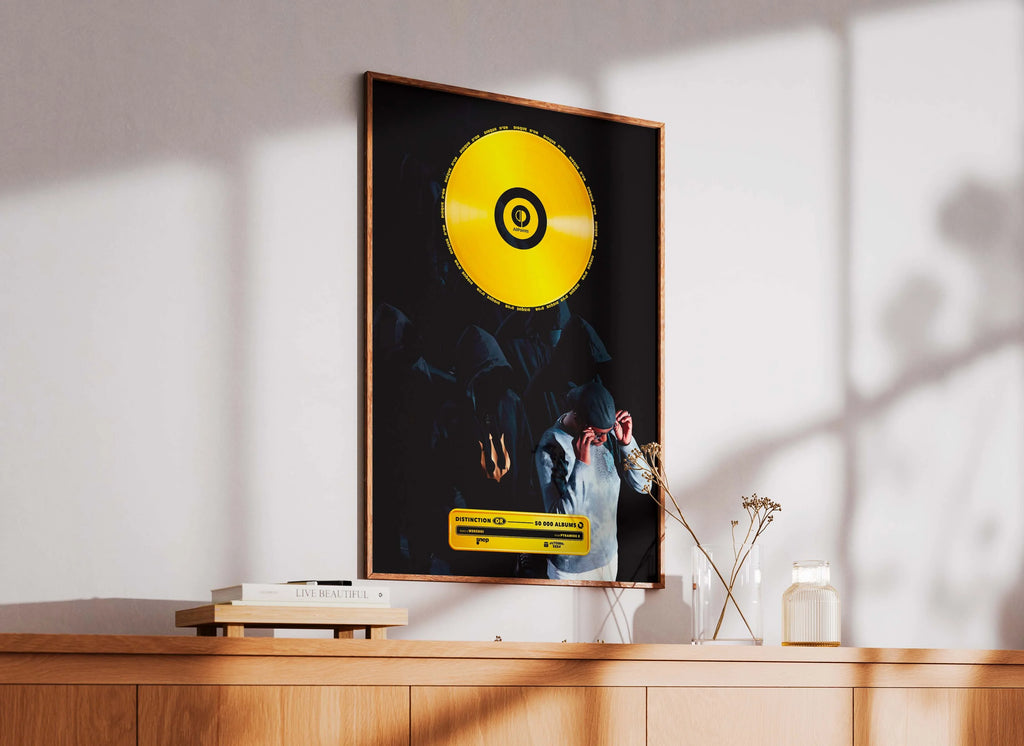 Les disques d'or sont envoyés dans des cartons rigides recyclés rectangulaires, adaptés à la taille commandée, pour garantir leur protection. Les posters au format A5 et A4 seront expédiés dans une épaisse enveloppe matelassée, tandis que les formats A3 et A2 seront soigneusement roulés et envoyés dans des tubes de livraison rigides et écologiques. Ces solutions d'emballage assurent une réception en parfait état de votre commande.