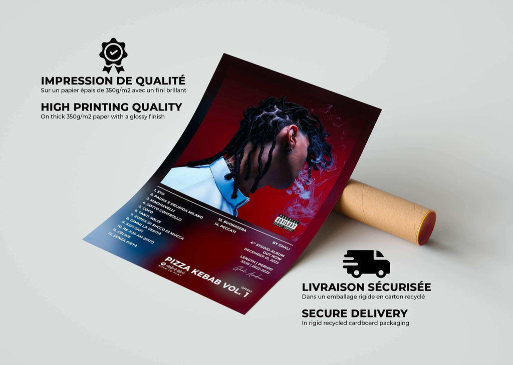 Les disques d'or sont envoyés dans des cartons rigides recyclés rectangulaires, adaptés à la taille commandée, pour garantir leur protection. Les posters au format A5 et A4 seront expédiés dans une épaisse enveloppe matelassée, tandis que les formats A3 et A2 seront soigneusement roulés et envoyés dans des tubes de livraison rigides et écologiques. Ces solutions d'emballage assurent une réception en parfait état de votre commande.