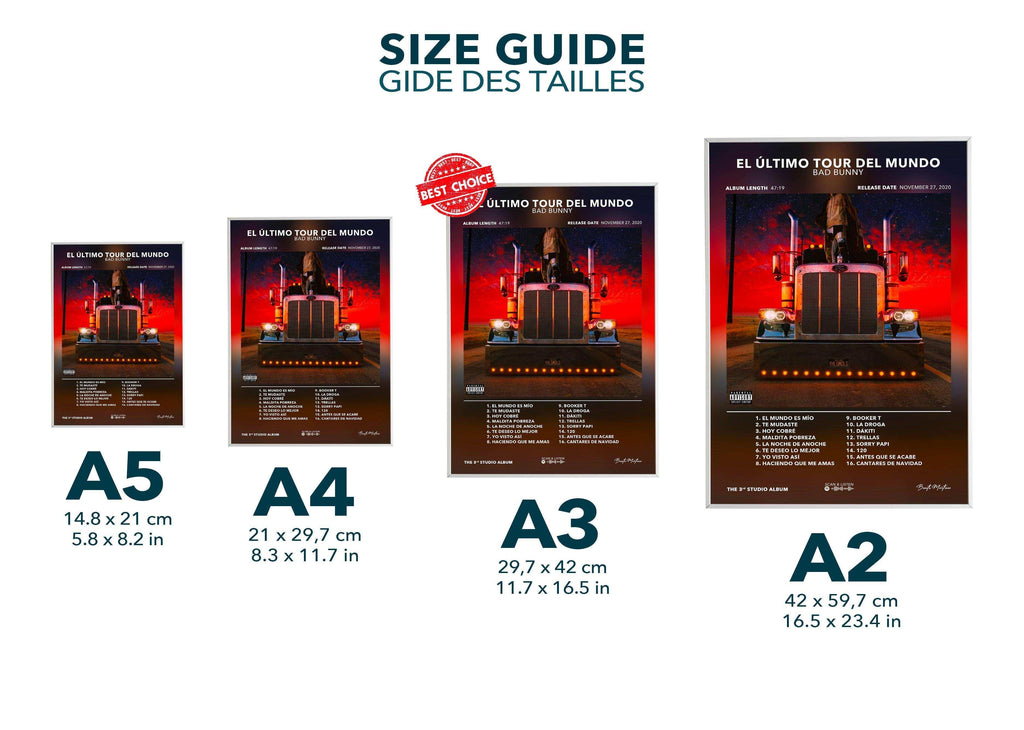 Les disques d'or sont envoyés dans des cartons rigides recyclés rectangulaires, adaptés à la taille commandée, pour garantir leur protection. Les posters au format A5 et A4 seront expédiés dans une épaisse enveloppe matelassée, tandis que les formats A3 et A2 seront soigneusement roulés et envoyés dans des tubes de livraison rigides et écologiques. Ces solutions d'emballage assurent une réception en parfait état de votre commande.