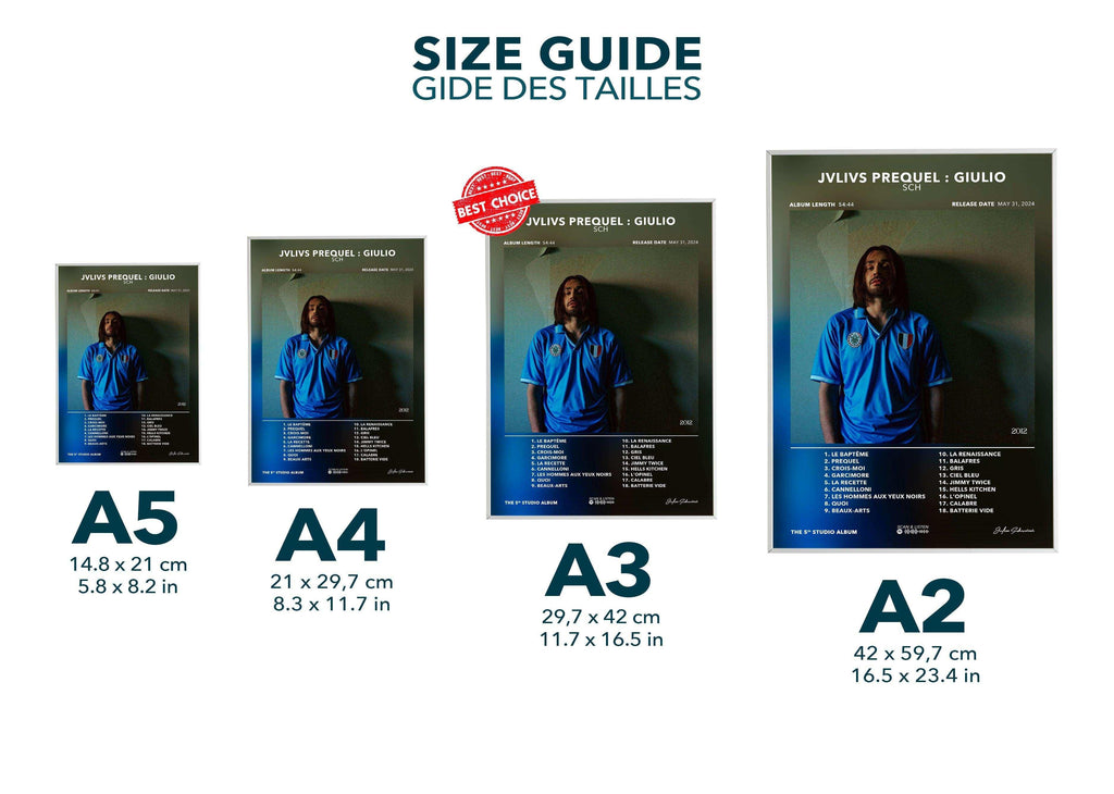 Les disques d'or sont envoyés dans des cartons rigides recyclés rectangulaires, adaptés à la taille commandée, pour garantir leur protection. Les posters au format A5 et A4 seront expédiés dans une épaisse enveloppe matelassée, tandis que les formats A3 et A2 seront soigneusement roulés et envoyés dans des tubes de livraison rigides et écologiques. Ces solutions d'emballage assurent une réception en parfait état de votre commande.