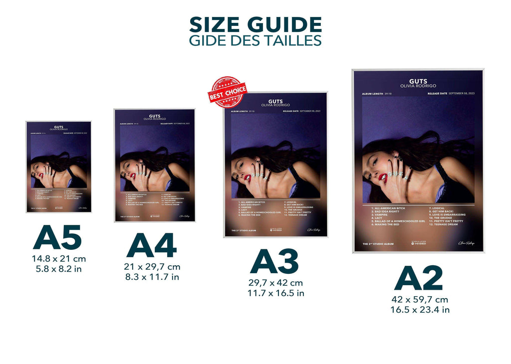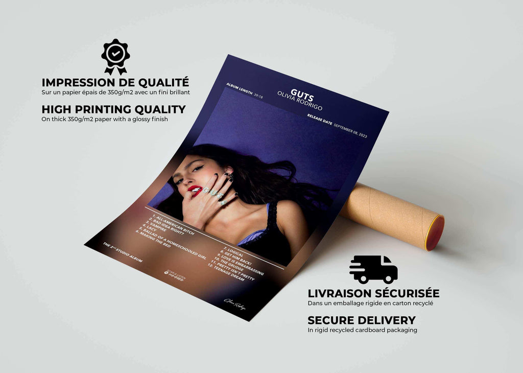 Les disques d'or sont envoyés dans des cartons rigides recyclés rectangulaires, adaptés à la taille commandée, pour garantir leur protection. Les posters au format A5 et A4 seront expédiés dans une épaisse enveloppe matelassée, tandis que les formats A3 et A2 seront soigneusement roulés et envoyés dans des tubes de livraison rigides et écologiques. Ces solutions d'emballage assurent une réception en parfait état de votre commande.